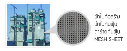 ใช้สำหรับปกคลุมสถานที่ก่อสร้าง เส้นใยของผ้าใบก่อสร้างผลิตจากเนื้อโพลีเอสเตอร์ ทำให้ไม่ลามไฟ ผ้าใบก่อสร้างนี้ สามารถปกคลุมส่วนด้านข้างบริเวณรอบๆ ของสถานที่ก่อสร้างสูงทำให้ฝุ่นที่เกิดจากการก่อสร้างไม่กระจัดกระจายออกมา บริเวณด้านข้างของพื้นที่ก่อสร้าง มีรูระบายอากาศ จึงทำให้ Mesh Sheet ต้านแรงลมน้อย ในกรณีที่ใช้สำหรับคลุมนั่งร้านจึงทำให้นั่งร้านไม่ล้ม Mesh Sheet นั้นแสงแดดสามารถส่องผ่านได้ จึงทำให้ในบริเวณพื้นที่ก่อสร้างมีแสงสว่างเพียงพอต่อการทำงาน มีความคงทนของสีที่ดี การป้องกันไฟไหม้ ป้องกันรังสียูวีและปลอดสารพิษสิ่งแวดล้อม ทนต่อการใช้งาน มีความหนาพิเศษ สามารถใช้ใหม่ได้